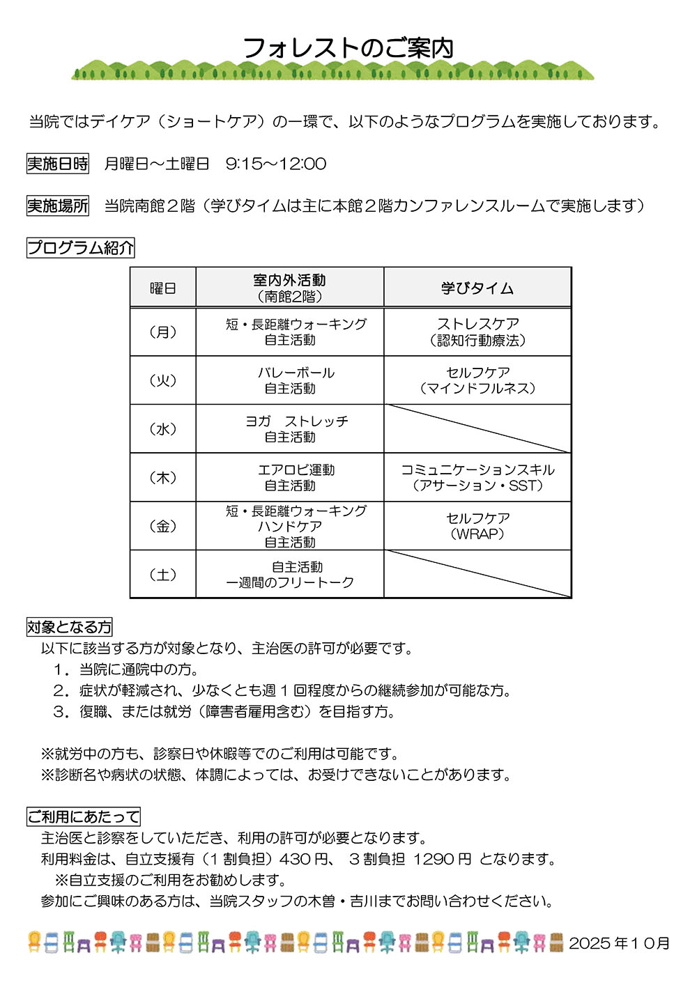 ①フォレストのご案内(PDFで開く) ②学びタイムのお知らせ(PDFで開く) ③学びタイムの日程のお知らせ(PDFで開く)